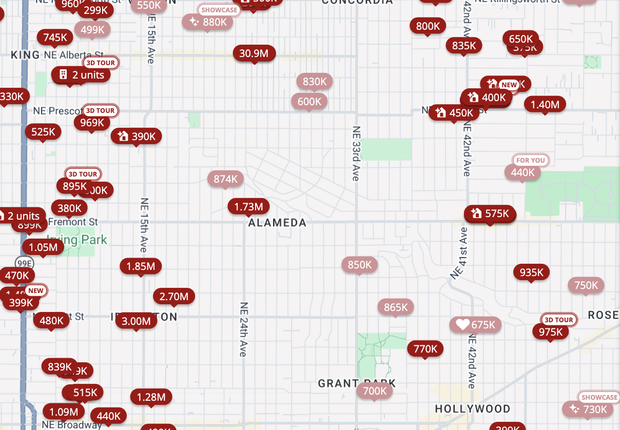 Alameda is a Northeast Portland neighborhood platted in 1909 and known for early 20th-century architecture, tree-lined streets, and its location along Alameda Ridge. Housing consists primarily of detached single-family homes in Craftsman, Tudor, and other historic styles. It is valued for architectural character and residential stability, with pricing that generally reflects lot size, home condition, and historic appeal.