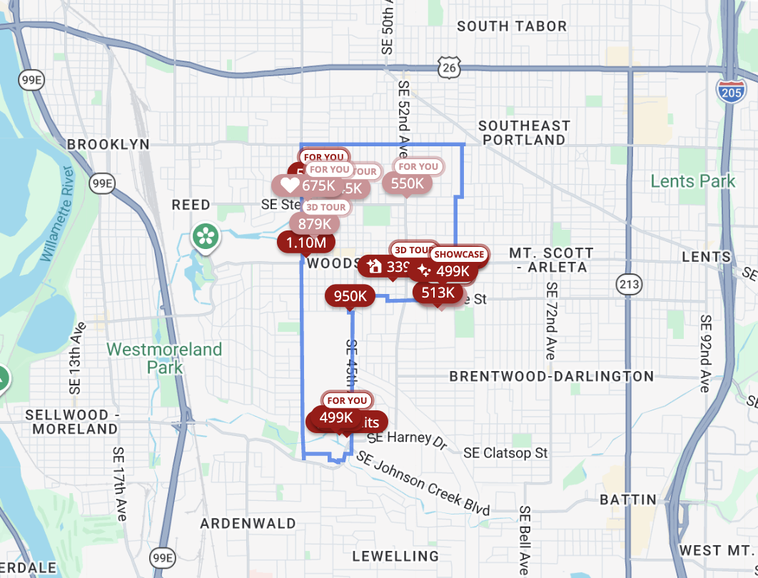 Woodstock is one of Portland’s older neighborhoods, first platted in 1889. Centered around Woodstock Boulevard, it combines a walkable commercial strip with residential streets of Craftsman, bungalow, mid-century, and newer infill homes. Housing prices vary by size, condition, and updates. The neighborhood is known for its village-style layout and balanced mix of historic and modern properties.